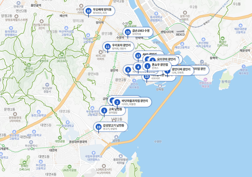 | 민락수변공원 | 진미횟집, 생선구이집 | 10분 내외 | 단체/가족 |