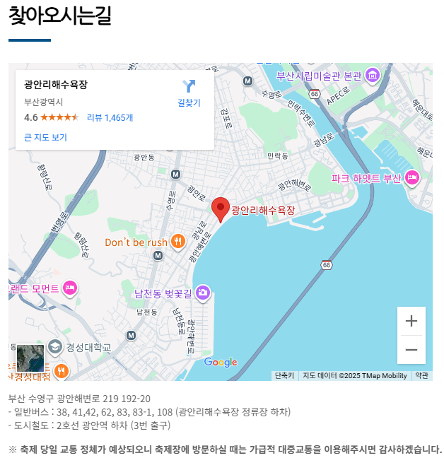 📍 버스: 38, 41, 42, 62, 83, 83-1, 108번 (광안리해수욕장 정류장 하차)